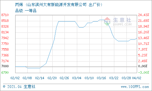 4月2日,山東濱州大有新能源開發(fā)有限公司丙烯最新報價上調,漲50元/噸至7950元/噸。