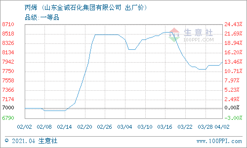 4月2日,山東金誠石化集團(tuán)有限公司丙烯最新報價上調(diào),漲70元/噸至7950元/噸。