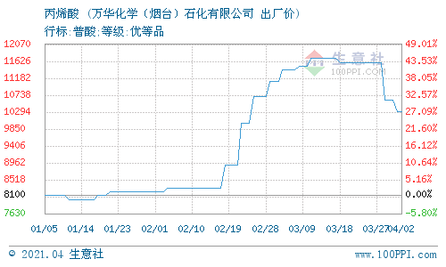 4月1日,萬華化學石化丙烯酸(華北)最新報價在10200元/噸,較上一交易日相比下調(diào)300元/噸,實際成交價以協(xié)商為主。