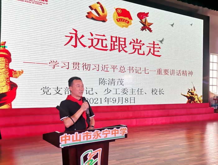 第三議程,由永寧中學(xué)少工委主任陳清茂校長作少先隊(duì)開學(xué)第一課《永遠(yuǎn)跟黨走》。陳校長從興國、富國、強(qiáng)國三個(gè)時(shí)期講述了中國共產(chǎn)黨在實(shí)現(xiàn)中華民族偉大復(fù)興進(jìn)程中取得的偉大成就;總結(jié)了實(shí)現(xiàn)中華民族偉大復(fù)興必須堅(jiān)持的成功經(jīng)驗(yàn),解讀中國共產(chǎn)黨的成功密碼;他激勵(lì)少先隊(duì)員們?cè)谛聲r(shí)代,要牢記殷切希望,勇?lián)鷼v史使命,立志做一個(gè)有理想、有志向、有追求、有責(zé)任感、有奉獻(xiàn)精神的接班人。