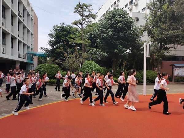 當天下午1:40教學區(qū)、宿舍區(qū)各樓層鳴響警報,全體進入應急狀態(tài)。同學們在老師的指引下,立即彎腰、用手捂住口鼻,緊張有序地沿著逃生路線,迅速地向操場疏散撤離。從警報聲響起到最后一個同學來到球場,共用時2分50秒,全體師生認真參與。
