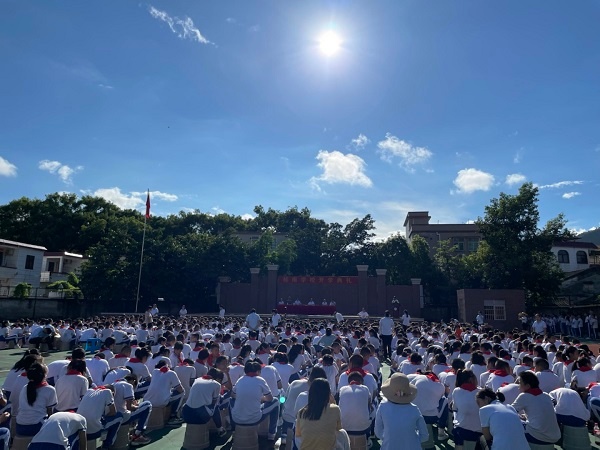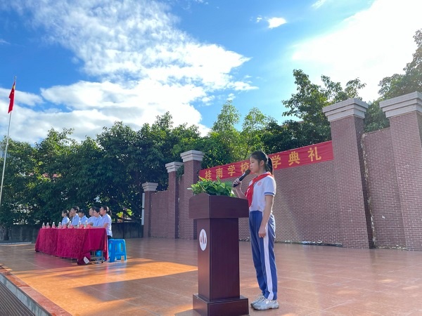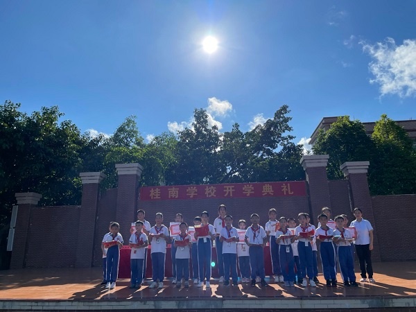 金風(fēng)送爽,丹桂飄香,又是一個(gè)新學(xué)年的開始。2021年9月3日上午8:00,桂南學(xué)校小學(xué)部全體師生歡聚在學(xué)校運(yùn)動(dòng)場(chǎng),舉行了秋季開學(xué)典禮。莊嚴(yán)的升旗儀式拉開了開學(xué)典禮的帷幕。雄壯的國歌響起,五星紅旗冉冉升起,全體師生面向國旗致敬。