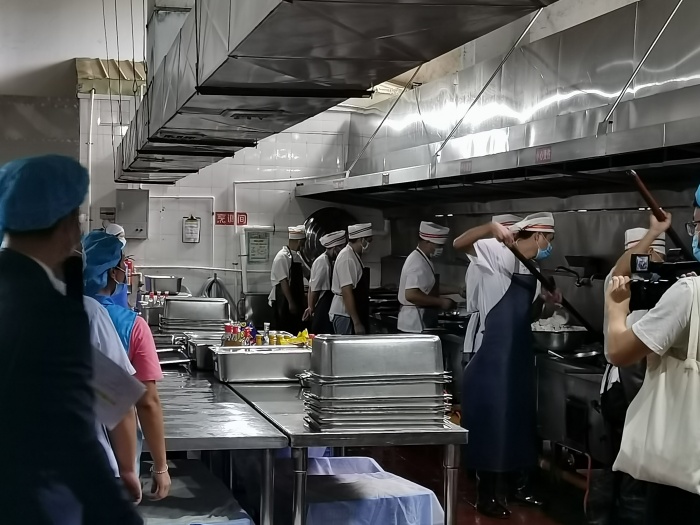 在網(wǎng)絡(luò)直播鏡頭的實(shí)況直播下,檢查組一行首先來(lái)到學(xué)校的食品快檢室,對(duì)食品安全監(jiān)測(cè)設(shè)備、監(jiān)測(cè)流程、監(jiān)測(cè)記錄、食品安全公示情況等進(jìn)行了詳細(xì)的檢查和實(shí)況直播。隨后,檢查組深入到學(xué)校食堂的每一處,對(duì)食堂防疫措施、食品采購(gòu)、食品清洗、食品加工、食品檢測(cè)、食品衛(wèi)生、食材的存儲(chǔ)和來(lái)源、餐具消毒、大米質(zhì)量、菜品種類等情況進(jìn)行了詳細(xì)地檢查,視頻攝制組也對(duì)現(xiàn)場(chǎng)的情況進(jìn)行了實(shí)況直播。