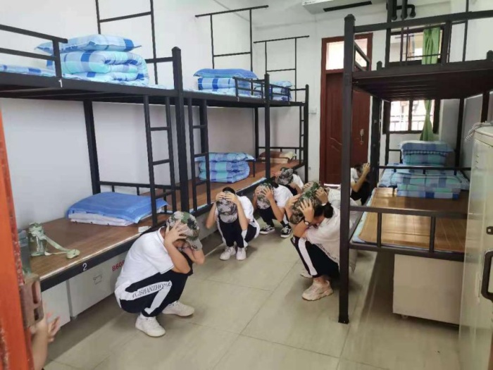 下午,宿舍地震疏散逃生演練正式開始。只聽模擬地震發(fā)生的信號——三聲短哨聲傳來,宿舍里的同學(xué)們行動迅速,立即就近躲避,用手保護(hù)著自己的頭部和頸部,背靠柜子、床架或墻角。接著,一聲長哨信號傳來,學(xué)生陸續(xù)開始疏散。各班班主任在指定位置、在恰當(dāng)時機(jī)燃放早已準(zhǔn)備好的無毒煙霧彈,為地震演習(xí)營造了更逼真的效果。守在樓梯口的老師們一邊維持秩序,一邊提醒同學(xué)們做好抱頭、彎腰、捂鼻等必要動作。同學(xué)們疏散到廣場后,各班班主任快速清點(diǎn)本班人數(shù)并及時報告。在整個疏散過程中,師生配合默契,組織有條不紊,人人各盡其責(zé)。