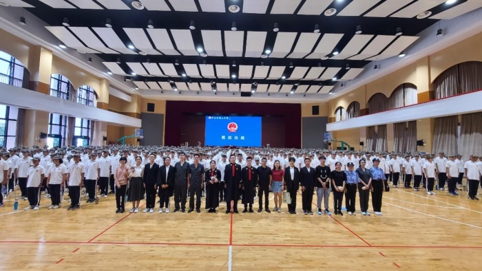 9月27日下午,桂山中學(xué)在陳戈平體育館開展了一場別開生面的模擬法庭活動。此次模擬法庭活動以一起校園早戀引發(fā)的校園欺凌致過失傷人案件為素材,桂山中學(xué)14名高一新生分別扮演法官、公訴人、辯護人、被害人、被告人等角色,為1000多名高一軍訓(xùn)新生上了一堂生動的觀摩法治教育課。中山市第一人民法院三鄉(xiāng)人民法庭副庭長鄒軍,中山市第一人民法院審判管理辦公室王俊超、苑鵬作為特邀專家出席活動,德育處陳建科副主任擔(dān)任本次活動主持。