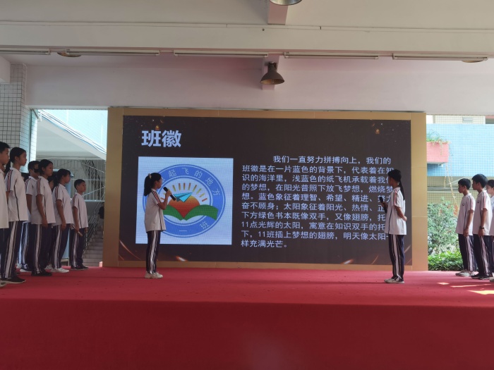 巡展班級按照“班名展示”、“班徽展示”、“班級口號、目標、誓詞展示”、“小組文化展示”、“班級文化布置展示”、“班級特色才藝展示”、“班歌展示”等基本流程進行展示。各班同學(xué)充分發(fā)揮聰明才智,精心設(shè)計班名和班徽,制定班規(guī)、公約和奮斗目標,展示本班的特色和風(fēng)采。