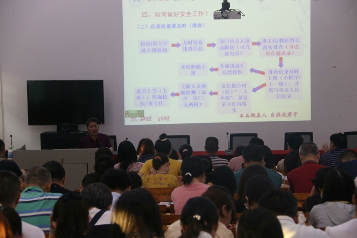 黎碧東校長首先肯定了開學(xué)以來全體老師在配合學(xué)校疫情防控、加強校園值班、落實學(xué)校安全管理要求等方面的良好表現(xiàn),認為正是全體老師的辛勤付出,才保障了學(xué)校各項工作的順利開展。其次,在國慶節(jié)即將來臨之際,黎碧東校長也把當(dāng)前全國疫情防控的形勢向全體老師做了通報,并從校門口安全、刀具管控、食品安全、交通安全、消防安全、防溺水安全、防小孩獨居安全、疫情防控(新冠肺炎疫情、季節(jié)性傳染病)等涉及校園安全的各個方面提出了詳細的要求。同時,為了確保工作的順利開展,黎校長也把學(xué)校的安全管理架構(gòu)、應(yīng)急處置流程、請假的相關(guān)流程等再次跟全體老師進行了學(xué)習(xí)和培訓(xùn)。