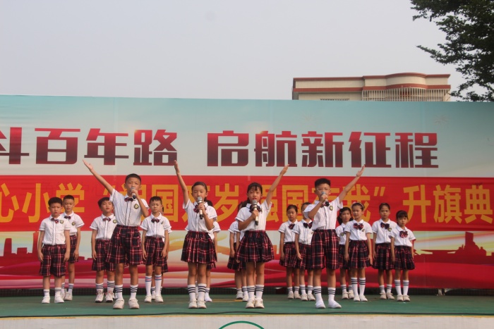 活動(dòng)伊始,雄渾的國(guó)歌蕩漾在校園,初升的紅日照耀在美麗的中心小學(xué)。當(dāng)激昂的國(guó)歌響起,鮮艷的五星紅旗緩緩升起,全體師生行注目禮,用心感受著國(guó)旗升起的莊嚴(yán)時(shí)刻。升旗儀式后,吳博事校長(zhǎng)發(fā)表熱情洋溢的致辭。吳校長(zhǎng)深情祝賀祖國(guó)72歲華誕,72年風(fēng)雨兼程,72年勵(lì)精圖治,偉大的中國(guó)發(fā)生了翻天覆地的變化。他盛情邀請(qǐng)全體師生,高聲同祝:“祖國(guó),生日快樂!祖國(guó)萬歲,強(qiáng)國(guó)有我!”向全體師生寄予厚望,勉勵(lì)大家用實(shí)際行動(dòng)擦靚那一抹“中國(guó)紅”,涵養(yǎng)家國(guó)情懷,砥礪強(qiáng)國(guó)之志,為祖國(guó)的偉大復(fù)興共同奮斗!隨后,校合唱隊(duì)演唱《少年,少年,祖國(guó)的春天》,學(xué)生們嘹亮的歌聲飽含向往祖國(guó)美好未來、期待中華民族振興的熱切希望。學(xué)校致力于把下一代教育好、培養(yǎng)好,從娃娃抓起,從小根植愛國(guó)情懷,立志報(bào)國(guó)。三(6)班學(xué)生共同朗誦《祖國(guó)媽媽,我愛您》。他們的朗誦充滿激情,或慷慨激昂,或低沉婉轉(zhuǎn),或抑揚(yáng)頓挫,以飽滿的熱情,挺直的脊梁,發(fā)自肺腑聲音,深情訴說著對(duì)祖國(guó)的熱愛。