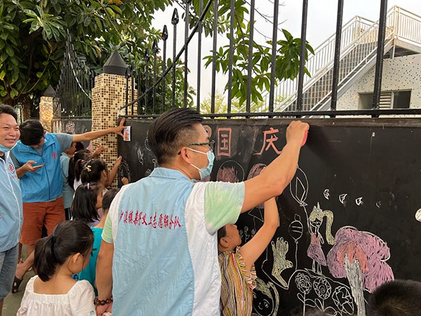 為使學(xué)生了解新中國(guó)建立的艱辛歷程和祖國(guó)建設(shè)取得的偉大成就,理解中國(guó)共產(chǎn)黨領(lǐng)導(dǎo)中國(guó)人民走社會(huì)主義道路是歷史的必然選擇,增強(qiáng)對(duì)偉大祖國(guó)、黨和人民的熱愛(ài),進(jìn)一步把愛(ài)國(guó)情感化為具體行動(dòng),立志為實(shí)現(xiàn)中華民族偉大復(fù)興作出貢獻(xiàn),在祖國(guó)母親生日到來(lái)之際,濠涌小學(xué)的黨員教師帶領(lǐng)家長(zhǎng)義工和學(xué)生一起布置起班級(jí)的涂鴉墻。小小巧手贊祖國(guó),大大畫(huà)筆繪山河,涂鴉墻在大家的共同努力下充滿了節(jié)日喜慶的色彩,為獻(xiàn)禮祖國(guó)涂上了濃墨重彩的一筆。