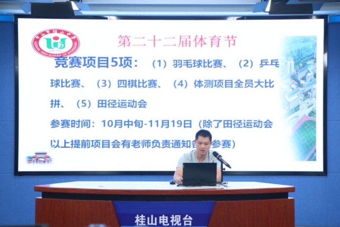 金秋時(shí)節(jié),天高氣爽。10月11日清晨,中山市桂山中學(xué)利用校園電視臺(tái)直播方式舉行了主題為“錘煉品德 剛強(qiáng)不屈”的第二十二屆體育節(jié)開幕式。團(tuán)委書記嚴(yán)玉龍主持校會(huì),全校師生在課室同步收看。