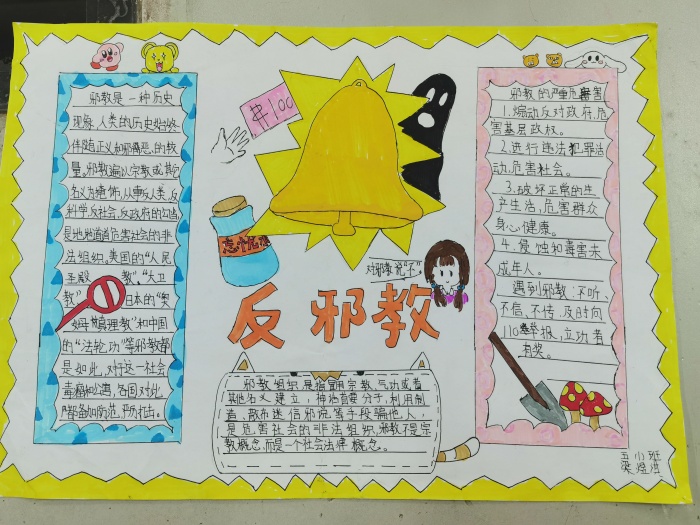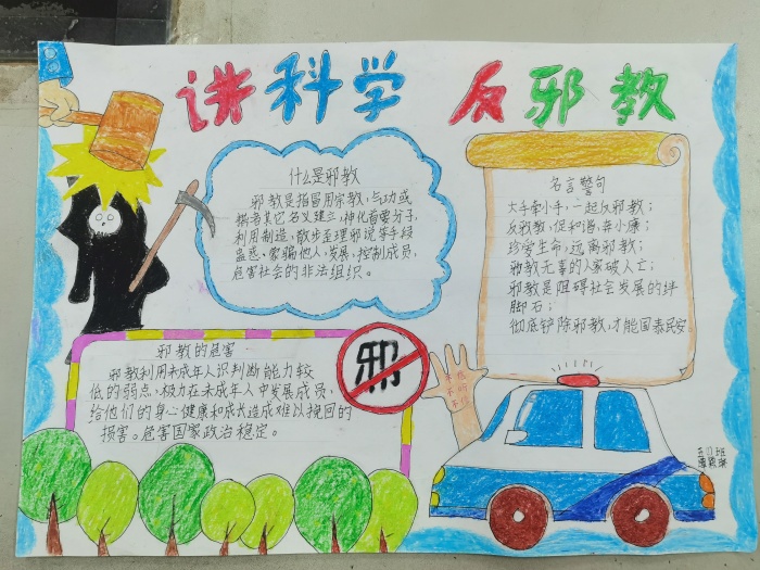 除此以外,學校也組織開展了“講科學,反邪教”手抄報創(chuàng)作活動。在學校德育處的安排下,學生利用國慶假期深入地了解了邪教的概念與危害等,并把學習到的知識融入到手抄報作品中。通過此次手抄報創(chuàng)作中,進一步提升了學生認識和抵制邪教的意識和能力。