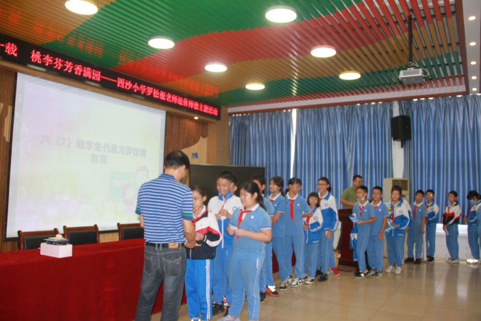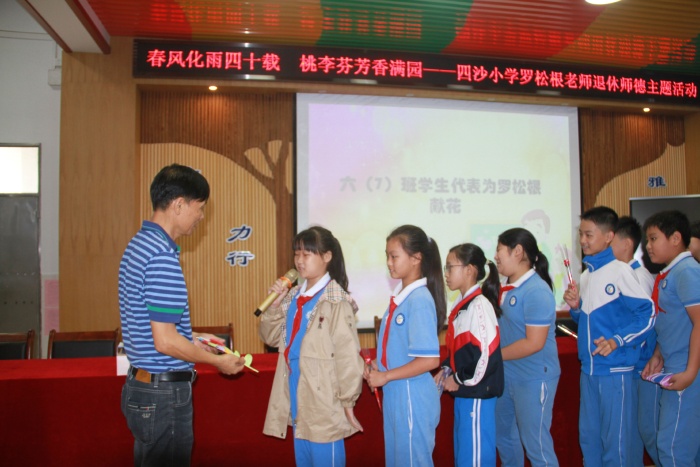 在經(jīng)久不息的掌聲中,四沙小學(xué)校長(zhǎng)歐慧芳向羅松根老師贈(zèng)送了上書(shū)“春風(fēng)化雨四十載 桃李芬芳香滿(mǎn)園”的錦旗,表達(dá)了對(duì)羅松根老師為人民的教育事業(yè)所作出的巨大貢獻(xiàn)的充分肯定。羅老師也上臺(tái)作了發(fā)言。他希望全體同學(xué)聽(tīng)老師的話(huà),好好學(xué)習(xí),天天向上,長(zhǎng)大后做一個(gè)對(duì)社會(huì)有用的人。