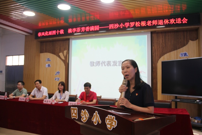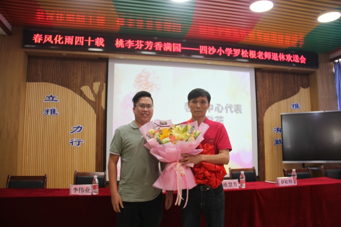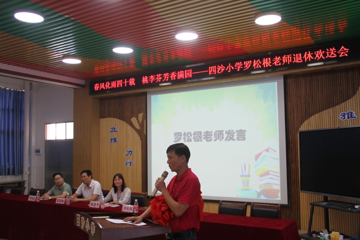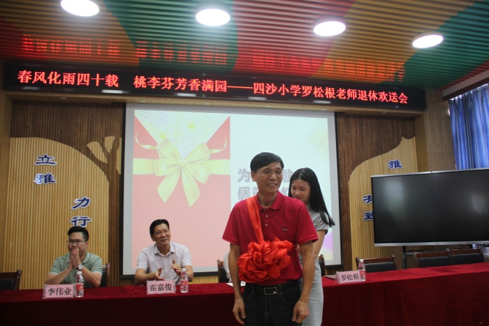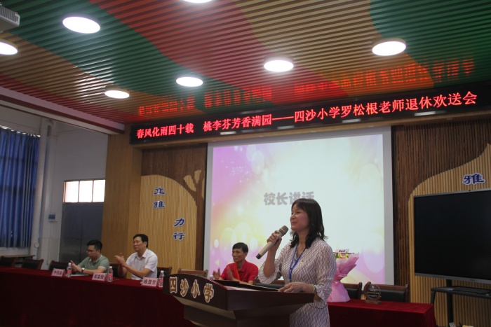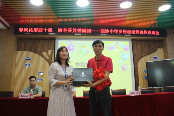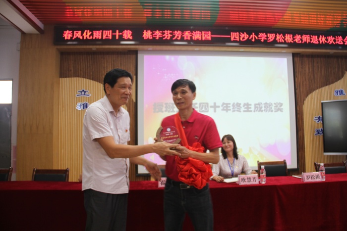 在熱烈的掌聲中,四沙小學校長歐慧芳代表學校給羅松老師贈送了紀念品,鎮(zhèn)教育和體育事務中心代表李偉業(yè)為羅松根老師獻上了鮮花,霍嘉俊主任授予羅松根老師 “班主任四十年終身成就獎”牌匾,感謝和肯定了羅松根老師為人民的教育事業(yè)作出的突出貢獻。隨后歐慧芳也代表學校作了熱情洋溢的講話,祝賀羅松根老師光榮退休,肯定了羅松根老師幾十年如一日地在本職工作崗位上默默耕耘。無論是班主任工作還是教學工作,都力爭做到最好。特別是擔任學校象棋社團的輔導老師12年來,羅松根經常犧牲自己午睡時間,對學生進行象棋的輔導培訓。所輔導學生參加鎮(zhèn)的象棋比賽已榮獲12連冠的好成績,參加市的同類比賽也名列前茅。羅老師把人生最美好的青春年華獻給了教育事業(yè),是老師們學習的楷模。歐慧芳號召全體教師向羅松根老師學習,把羅松根老師無私奉獻、積極進取的精神發(fā)揚光大。希望羅松根老師科學安排晚年生活的同時,?;丶铱纯?,幸福、健康、快樂過好每一天。