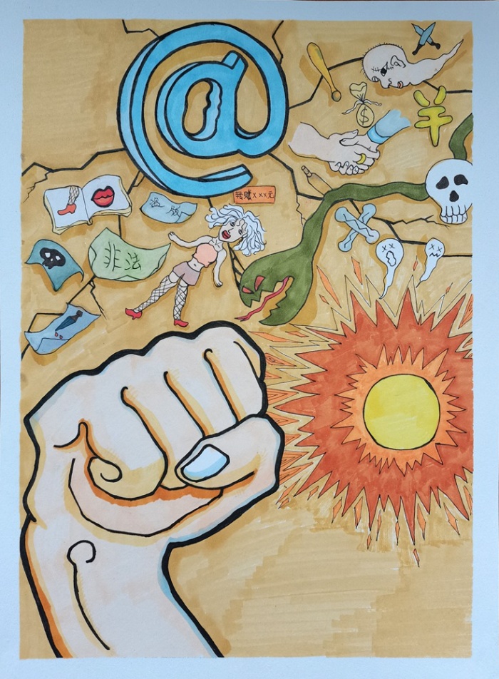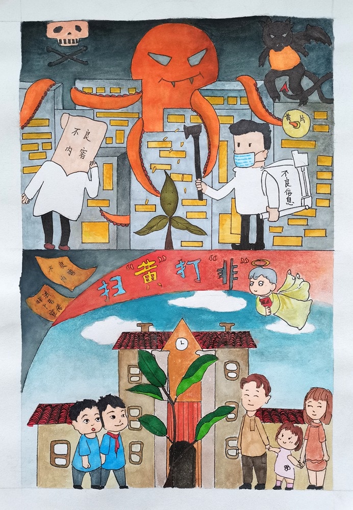 中共中央、國務院轉發(fā)的“八五”普法規(guī)劃和《關于加強社會主義法治文化建設的意見》要求,加強青少年法治教育,全面落實《青少年法治教育大綱》,教育引導青少年從小養(yǎng)成尊法守法習慣。東升高級中學為大力宣傳“掃黃打非”知識,用好的藝術作品教育人、鼓舞人及感染人的功能,助推“掃黃打非”工作深入開展,2021年10月,學校德育處聯(lián)合美術科組舉辦“掃黃打非”法制繪畫大賽。