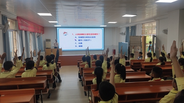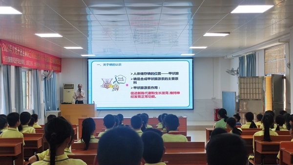 講座開始,首先由中山火炬開發(fā)區(qū)醫(yī)院鄧成主任為學(xué)生開展“碘缺乏病知識講座”,鄧醫(yī)生運(yùn)用生動的語言,典型的案例,通過深入淺出的講解和示范,分別從什么是碘,什么是碘缺乏病,碘缺乏病的危害及癥狀,如何正確食用碘、怎樣預(yù)防碘缺乏病等多個方面向?qū)W生傳授碘缺乏病的防控知識。學(xué)生們認(rèn)真的聽講,積極發(fā)言,明白了日常生活中不正確食用碘鹽的危害,以及平時在生活中如何正確補(bǔ)充“碘”。同學(xué)們?yōu)楦兄x鄧醫(yī)生的分享,現(xiàn)場響起一陣陣的掌聲。