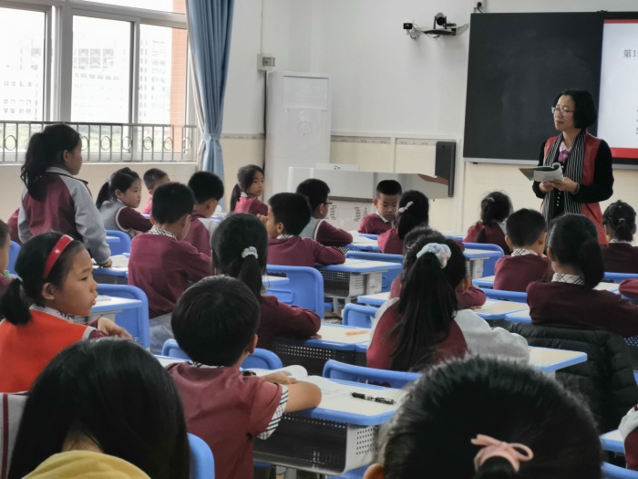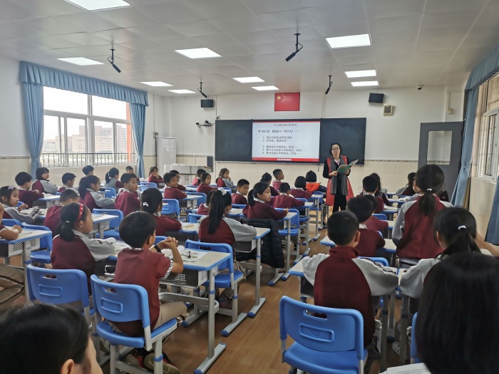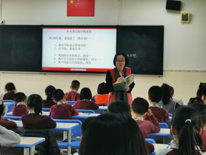 緊接著,是學(xué)生分組匯報(bào)環(huán)節(jié)。學(xué)生在指導(dǎo)下,完整而清晰地匯報(bào)自己的學(xué)習(xí)所得。一個(gè)學(xué)生匯報(bào)完,緊接著下一個(gè)學(xué)生補(bǔ)充,學(xué)生由一開始的拘謹(jǐn)漸漸變得大方,對(duì)學(xué)校的了解也逐漸深入,課堂的學(xué)習(xí)氛圍愈發(fā)濃厚。