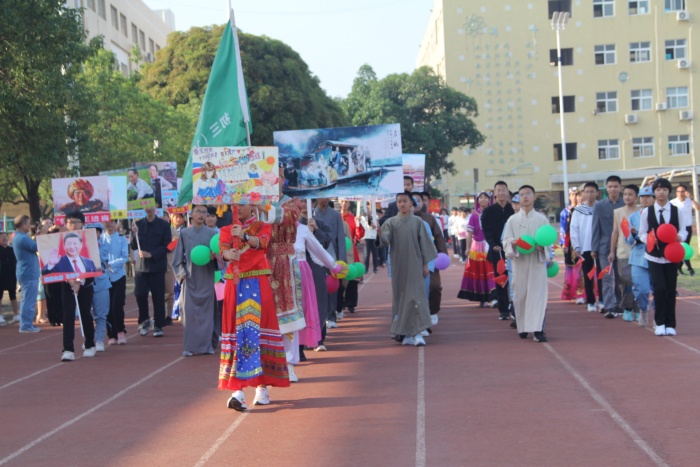 在秋日的艷陽之中,橫欄中學(xué)田徑場鑼鼓喧天、彩旗飄揚(yáng),學(xué)校國旗方陣、校旗方陣、裁判員方陣以及初一、初二、初三三個年級的班級方陣依次走過主席臺。各班隊(duì)伍精神飽滿、隊(duì)列整齊、口號響亮,整齊的班服、各具特色的民族服飾、鮮艷的五星紅旗、愛黨愛國的橫幅標(biāo)語,充分體現(xiàn)了橫中學(xué)子的創(chuàng)意、激情和夢想。