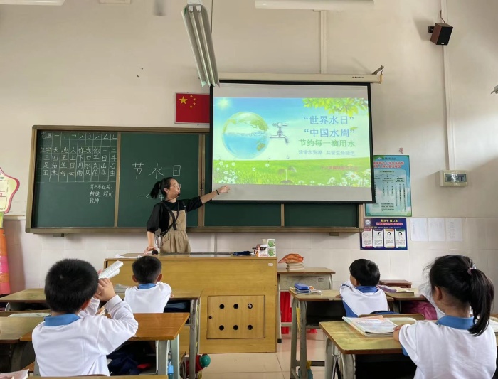 班會(huì)一開始,班主任用謎語來調(diào)動(dòng)起學(xué)生們對水的興趣,還用PPT圖文并茂為孩子們講解。班主任強(qiáng)調(diào)“雖然世界水日是3月22日,但是對于我們來說,每一天都是節(jié)水日?!薄拔覀?yōu)槭裁匆?jié)水?”“為什么會(huì)缺水?”緊接著一連串的反問句,讓每個(gè)學(xué)生都對這節(jié)主題班會(huì)課充滿了好奇?!耙?yàn)槲覀冇盟?。”“因?yàn)楹芏嗳死速M(fèi)水。”……同學(xué)們給出了自己的答案?!按蠹抑绬?,我們國家是一個(gè)缺水的國家,而水孕育生命,一切生命都離不開水。所以我們通過這種形式,來號(hào)召人們節(jié)約用水,并合理利用水資源。”班主任的話讓學(xué)生們認(rèn)識(shí)到了水的用途和重要性,而關(guān)于水的故事更是引得孩子們睜大了眼睛。班主任用生動(dòng)的語言,向?qū)W生們講述了各種與水有關(guān)的故事,水的來源、水的種類以及我們的生活用水是如何產(chǎn)生的,還用互動(dòng)的方式,提出各種問題,讓同學(xué)們回答,便于學(xué)生記住更多關(guān)于水的知識(shí)。