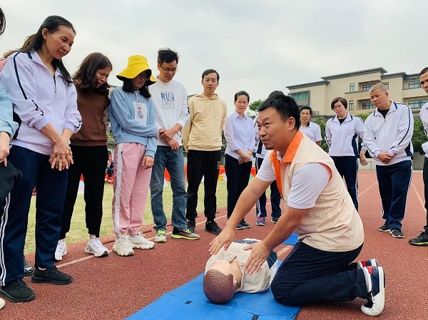 接下來,學(xué)校邀請廣東伍玖伍安全文化科技有限公司培訓(xùn)人員進(jìn)行應(yīng)急救護(hù)培訓(xùn)活動(dòng),培訓(xùn)志愿者們邊講解邊指導(dǎo)學(xué)生體驗(yàn)了消防帳篷、逃生防毒面具試戴、模擬觸電、滅火器使用等場景。在這種互動(dòng)式體驗(yàn)活動(dòng)中,學(xué)生們興致盎然,參與度高。學(xué)生們既獲得了安全知識教育,又獲得了應(yīng)急操作經(jīng)驗(yàn)。培訓(xùn)志愿者對老師們進(jìn)行了心肺復(fù)蘇、人工呼吸、海姆立克法的培訓(xùn),通俗易懂的講解,很快教會了老師們掌握不少急救的技巧和規(guī)范性的操作。