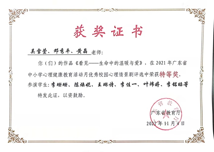 近日,廣東省教育廳公布了2021年中小學心理健康教育活動月獲獎名單。在吳雪萱、鄧秀平等老師的積極籌劃下,桂山中學作品《看見——生命中的溫暖與愛》,在廣東省優(yōu)秀校園心理情景劇的評選中榮獲特等獎。