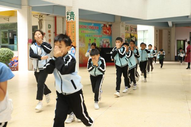 演習前,軒小應急疏散演練工作組從交通引導、報警計時、清點人員等環(huán)節(jié)都進行周密安排。本次演習活動以“上課時間發(fā)生教學樓火災”為預設背景。15點55分,校園響起“火情”預警信號,各樓層的同學在老師的帶領下用手捂住口鼻,彎下身體從樓道有序逃生。