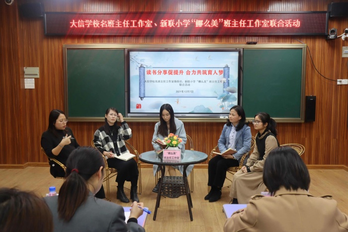聚是一團火,散是滿天星。為貫徹落實教育部下發(fā)的《關于進一步加強中小學班主任工作的意見》《中共中央辦公廳、國務院辦公廳關于進一步減輕義務教育階段學生作業(yè)負擔和校外培訓負擔的意見》(中辦發(fā)﹝2021﹞40號)以及《中小學德育工作指南》精神,提升班主任工作室成員隊伍專業(yè)化發(fā)展,促進班主任隊伍建設,2021年12月7日下午,大信學校班名主任工作室為創(chuàng)建巾幗文明崗,由工作室“擷香坊“和板芙鎮(zhèn)新聯(lián)小學“娜么美”班主任工作室聯(lián)合舉辦班主任讀書分享及主題沙龍活動。活動由大信學校德育處副主任高靜帶隊,名班主任工作室主持人林京京,擷香坊坊主高姍姍以及成員出席。