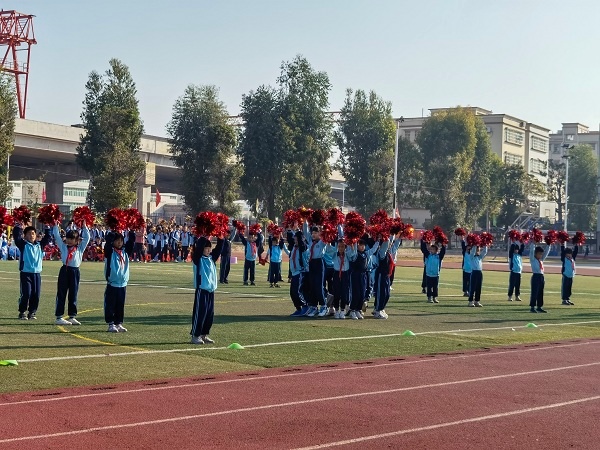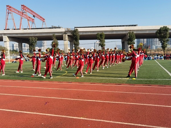 在激動的掌聲后,所有人期待的啦啦操表演開始了!一二年級的《天使gogogo》,三四年級的《快樂的歌》,五六年級的《足球?qū)氊悺罚夹愠隽烁髯缘奶厣途?。六年級的拉拉操表演秀《足球?qū)氊悺酚葹槲矍?,載歌載舞,有趣的隊型變換,引來了在場觀眾的陣陣喝彩。