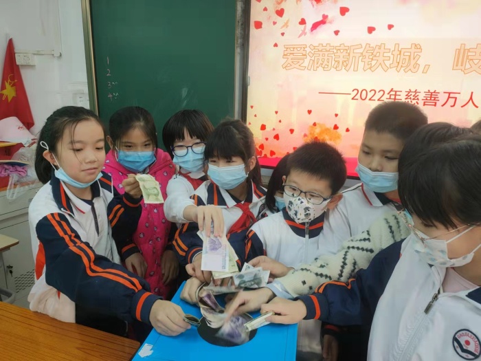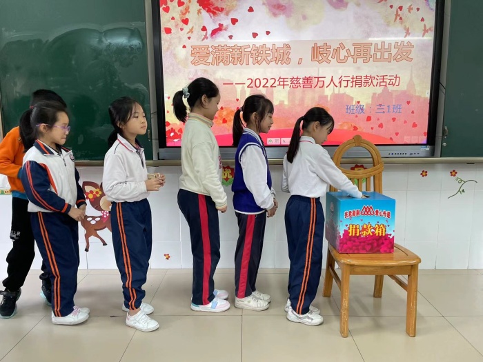 此次慈善萬人行活動主題為“愛滿新鐵城,岐心再出發(fā)”。在鄭結霞校長的引領下,學校的行政班子與老師們也齊心協(xié)力為慈善事業(yè)獻出一己之力。這一小小舉動,為學校的慈善萬人行捐款活動開了好頭。雖然秉承著自愿捐款,以力所能及之力奉獻愛的原則向孩子們發(fā)出倡議,但正如本次活動主題那般,整個愛心捐款活動收獲了孩子們滿滿的愛心。此次活動以班級為單位進行,利用大課間時間,由班主任主持此次的活動?;顒舆M行期間,看著孩子們將提前準備好的零錢迫不及待地平鋪在課桌上,滿臉笑顏地等待著自己走上捐款箱的那一刻。有的經過深思熟慮掏出自己珍藏多時的壓歲錢獻上愛心;有的則是和父母商量著從買零食、玩具的零花錢中拿出一部分出一臂之力;而有的孩子更是和父母一起為愛助航。看著那一張張被他們拽得有點皺巴巴的零錢,再看看他們臉上那幸福與滿足的笑臉,由衷為每個孩子心中的那份天真且簡單的愛心而感動。