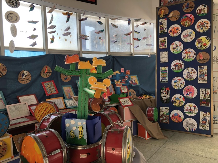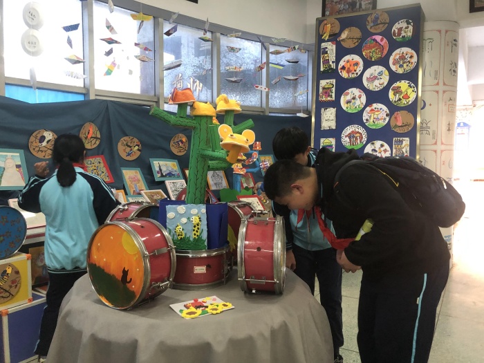 除此之外,安阜小學(xué)本次元旦畫展的一大亮點(diǎn)是傳達(dá)了環(huán)保的理念:學(xué)校美術(shù)興趣小組的同學(xué)們?cè)诶蠋煹膸ьI(lǐng)下把鼓號(hào)隊(duì)置換下來(lái)的舊小鼓變成了畫布,創(chuàng)作了一系列鼓面裝飾畫。為畫展增添了活潑的色彩。