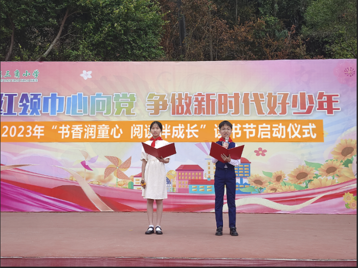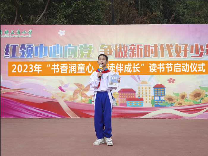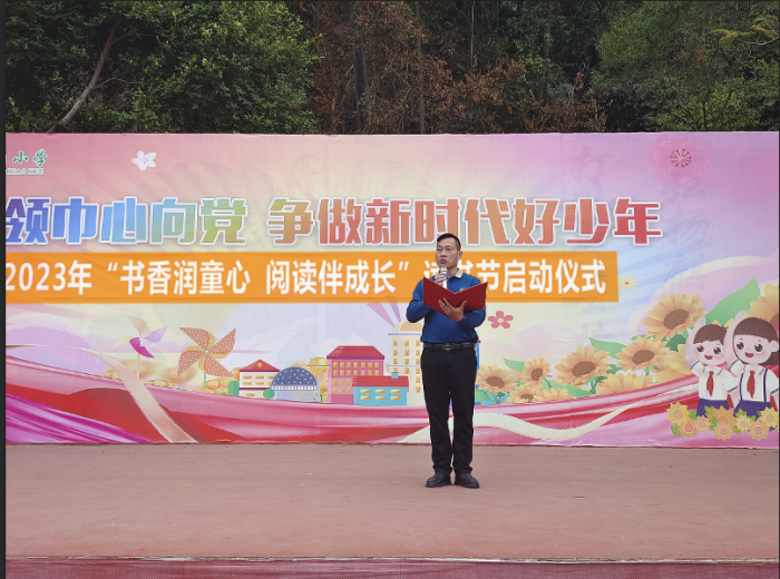 啟動儀式第二項,由三角小學(xué)副校長黃麗娟宣讀《三角鎮(zhèn)三角小學(xué)2023年“書香潤童心,閱讀伴成長”讀書節(jié)活動方案》。黃副校長向全體同學(xué)發(fā)出倡議,號召同學(xué)們積極參加讀書節(jié)的各項活動,將知識運(yùn)用到學(xué)習(xí)及生活當(dāng)中,努力做到知行合一。