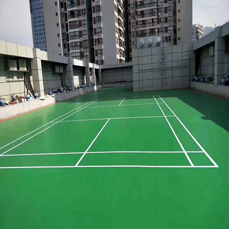 4、加強層:用丙烯酸填充劑全場涂刮一層以兌水摻60-80目石英砂。充分攪拌后用進口橡膠刮耙刮涂。在底層之上再提供一層均勻,濃密的墊層,增加球場強度。干透約需24小時。