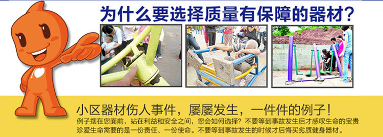 3、第三類是其他無任何活動性零部件的穩(wěn)固性器材。如固定式踏樁、平衡木(實際上是鋼鐵部件)、固定式的階梯、攀巖墻、仰臥起坐床等,由于不存在各部件的磨損、碰撞等現(xiàn)象,在戶外環(huán)境并同樣設定在基本無人日常管理的使用條件下,自2011年10月1日期實施室外健身器材新**標準所有器材的安全使用年限為8年。