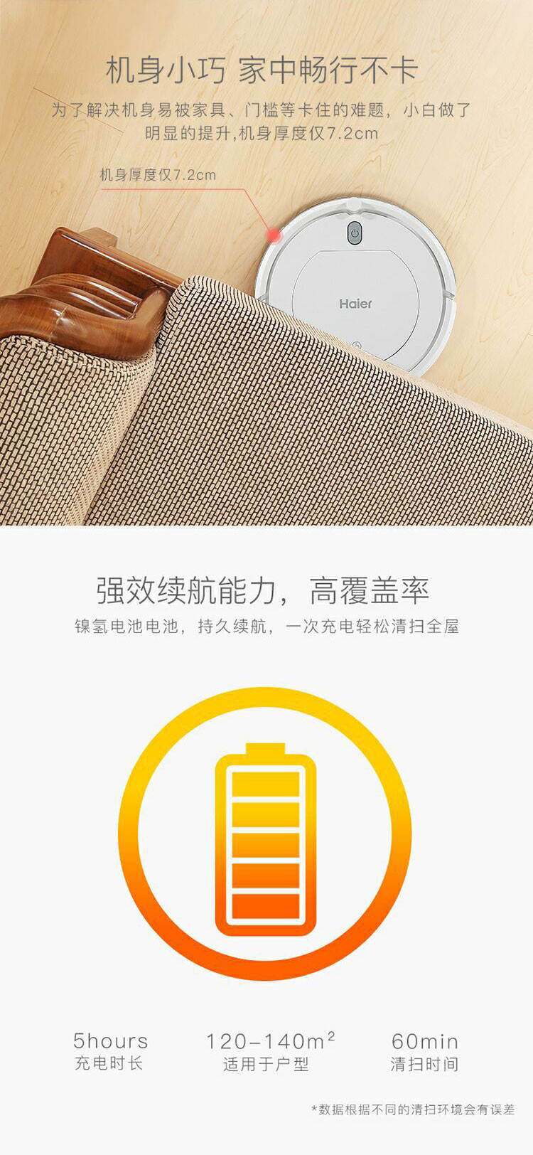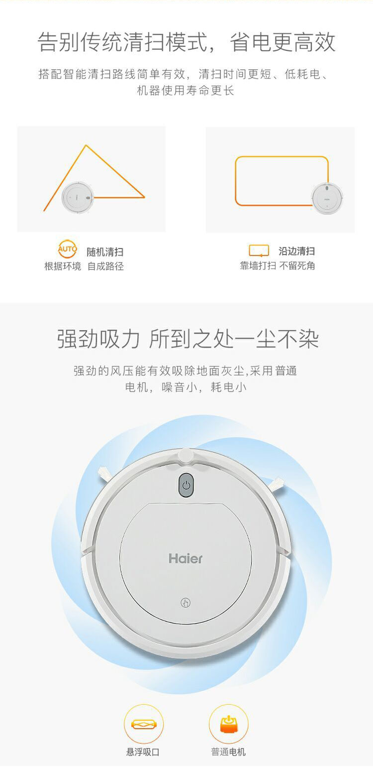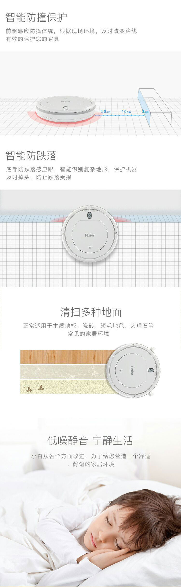 這款機(jī)器噪音非常的小,享受寧?kù)o干凈的生活。能根據(jù)環(huán)境自成路徑,靠墻打掃,沒(méi)有死角可言。底部還有防跌落的感應(yīng)眼睛,智能識(shí)別復(fù)雜的地形,保護(hù)機(jī)器及時(shí)調(diào)頭,防止跌落受損。前驅(qū)感應(yīng)防撞體統(tǒng),根據(jù)現(xiàn)場(chǎng)的環(huán)境能夠及時(shí)的改變路線,有效地保護(hù)您的家具和機(jī)器本身。機(jī)身厚度僅7.2cm,解決了機(jī)身被門檻、家具卡住的問(wèn)題,適用于木質(zhì)地板、瓷磚、短毛地毯、大理石等等常見(jiàn)的家居環(huán)境。海爾專注研發(fā)家電多年,值得信賴。