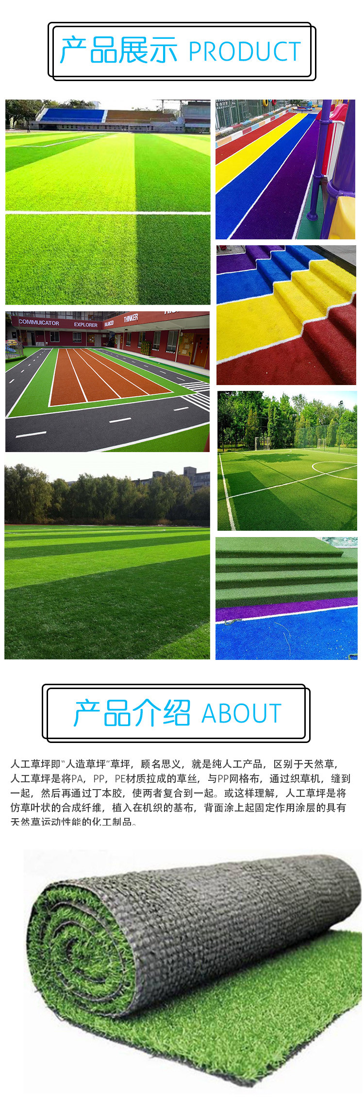 人工草坪即“人造草坪”草坪,顧名思義,就是純?nèi)斯ぎa(chǎn)品,區(qū)別于天然草,人工草坪是將PA,PP,PE材質(zhì)拉成的草絲,與PP網(wǎng)格布,通過(guò)織草機(jī),縫到一起,然后再通過(guò)丁本膠,使兩者復(fù)合到一起。或這樣理解,人工草坪是將仿草葉狀的合成纖維,植入在機(jī)織的基布,背面涂上起固定作用涂層的具有天然草運(yùn)動(dòng)性能的化工制品。