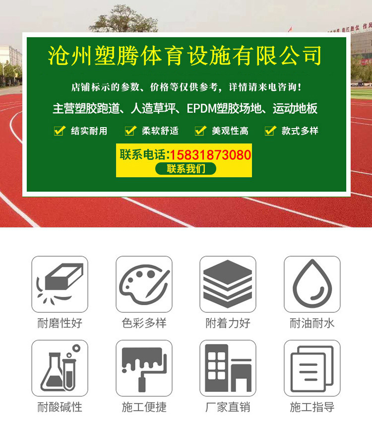 ??我公司擁有先進(jìn)的工藝技術(shù)和機(jī)械加工設(shè)備。專業(yè)生產(chǎn)各種規(guī)格的人工草坪、EPDM彩色橡膠顆粒、膠水等。廣泛應(yīng)用于塑膠跑道、籃球場(chǎng)、足球場(chǎng)、網(wǎng)球場(chǎng)、游泳池、體育場(chǎng)館運(yùn)動(dòng)地面、幼兒園防滑地面等。該產(chǎn)品具有綠色環(huán)保、色澤穩(wěn)定且抗紫外線、耐磨損、彈性好,使用壽命長,易鋪設(shè)保養(yǎng)等優(yōu)點(diǎn)。產(chǎn)品經(jīng)上海和深圳檢測(cè)中心檢測(cè),各項(xiàng)技術(shù)指標(biāo)全部合格,達(dá)到行業(yè)標(biāo)準(zhǔn)。 我們本著以質(zhì)量求生存,以周到的服務(wù)求發(fā)展,熱忱歡迎海內(nèi)外廣大客戶和我們合作,攜手共創(chuàng)輝煌!