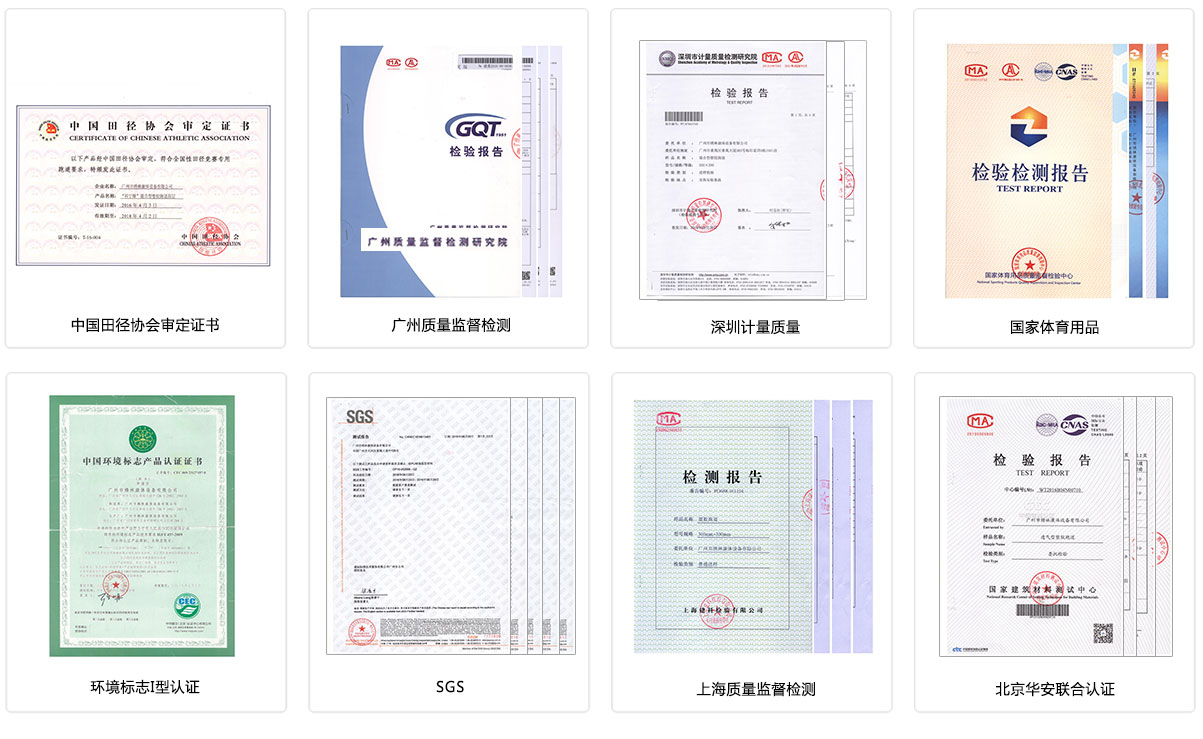 塑膠跑道獲得:中國田徑協(xié)會(huì)審定證書、廣州質(zhì)量監(jiān)督檢測(cè)、深圳計(jì)量質(zhì)量、國家體育用品、環(huán)境標(biāo)志I型認(rèn)證、SGS、上海質(zhì)量監(jiān)督檢測(cè)、北京華安聯(lián)合認(rèn)證等。