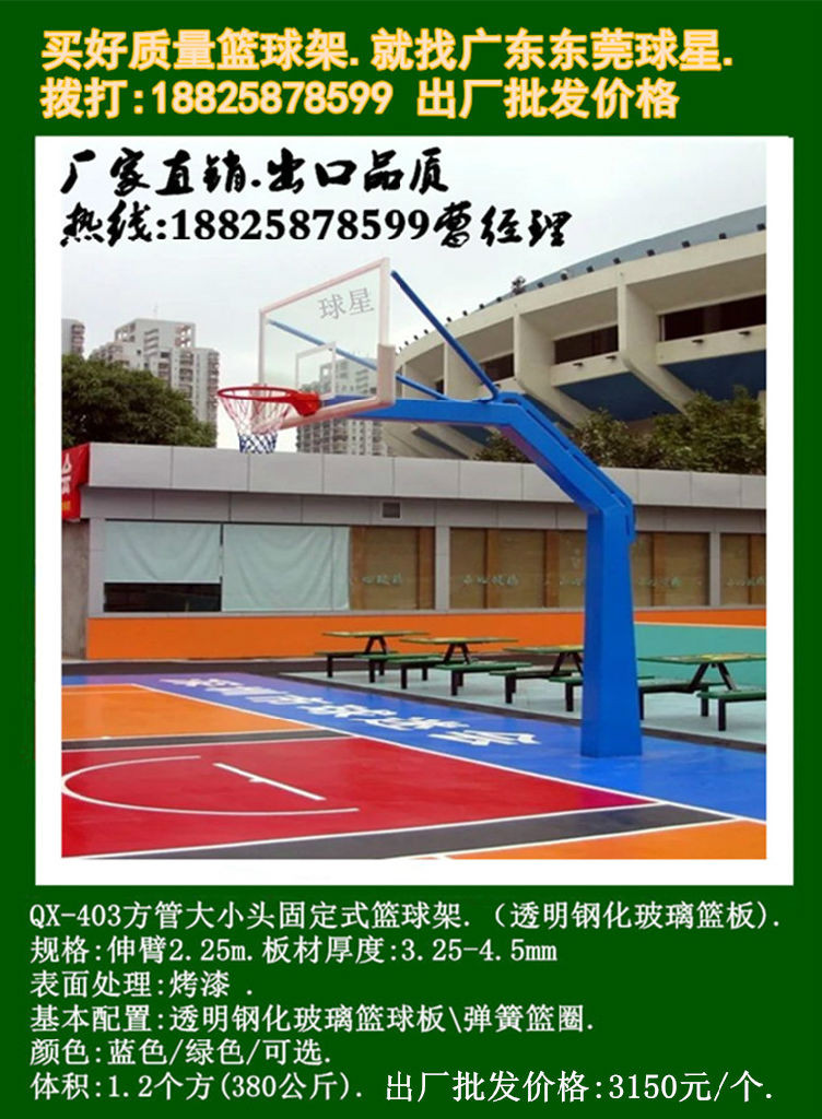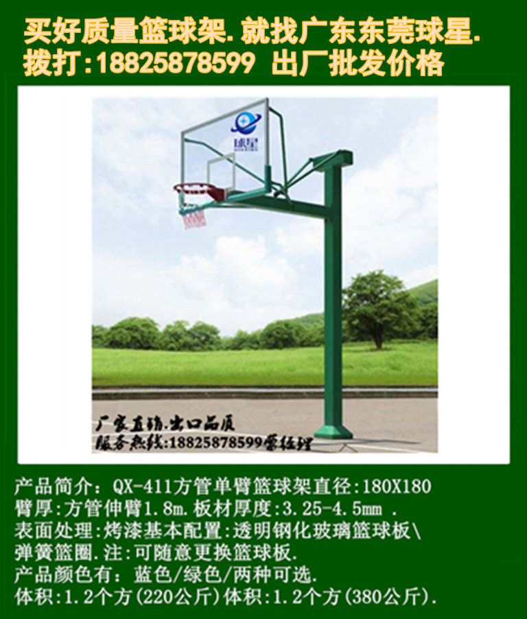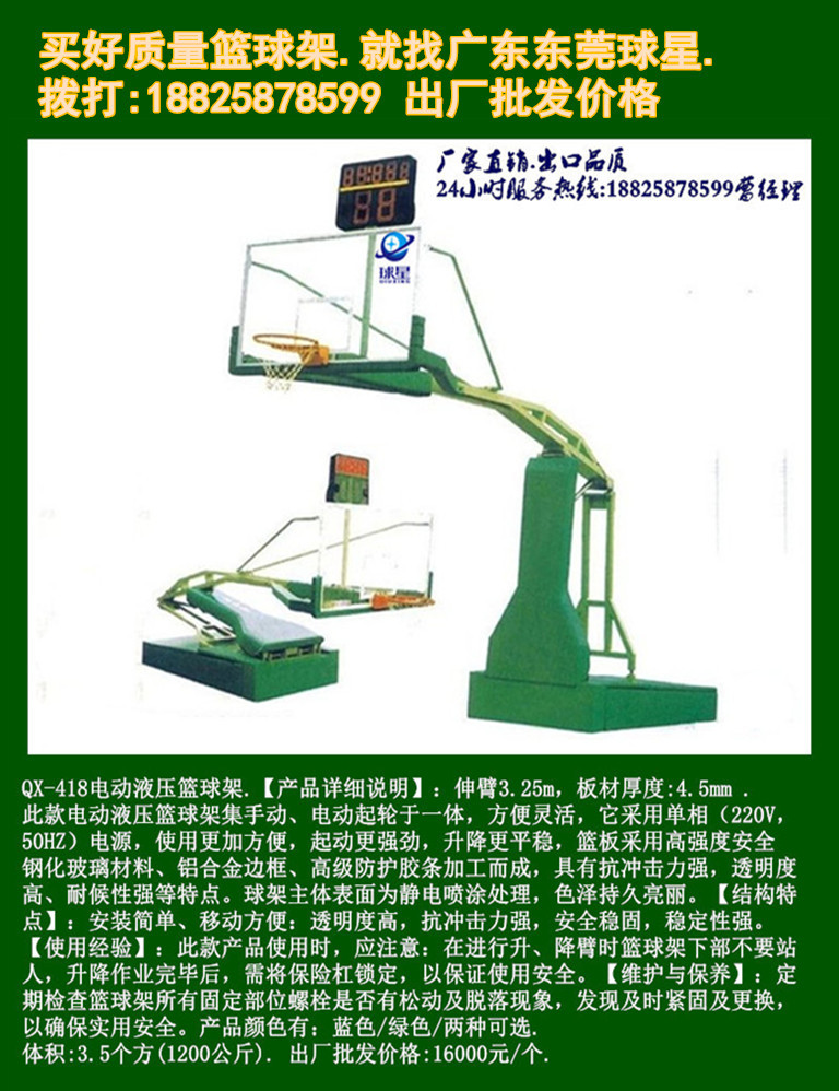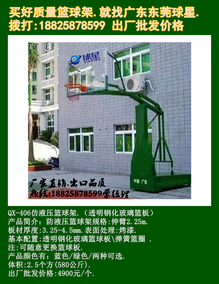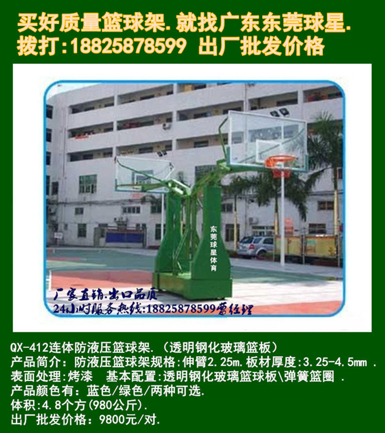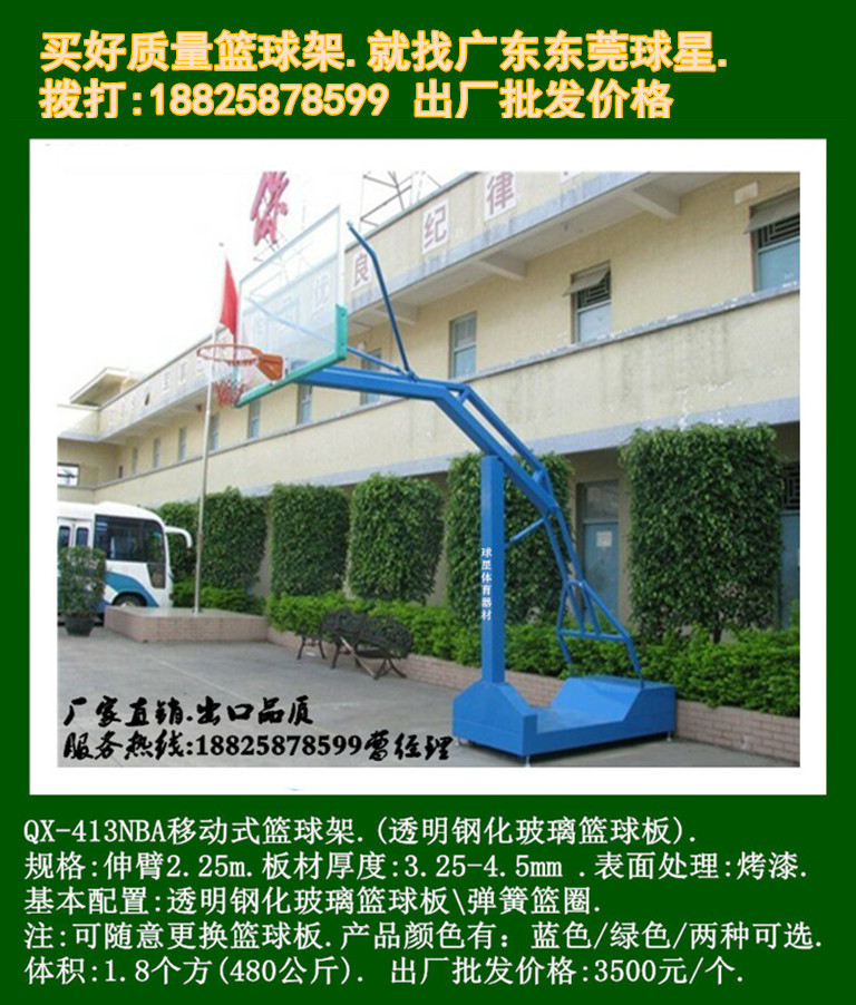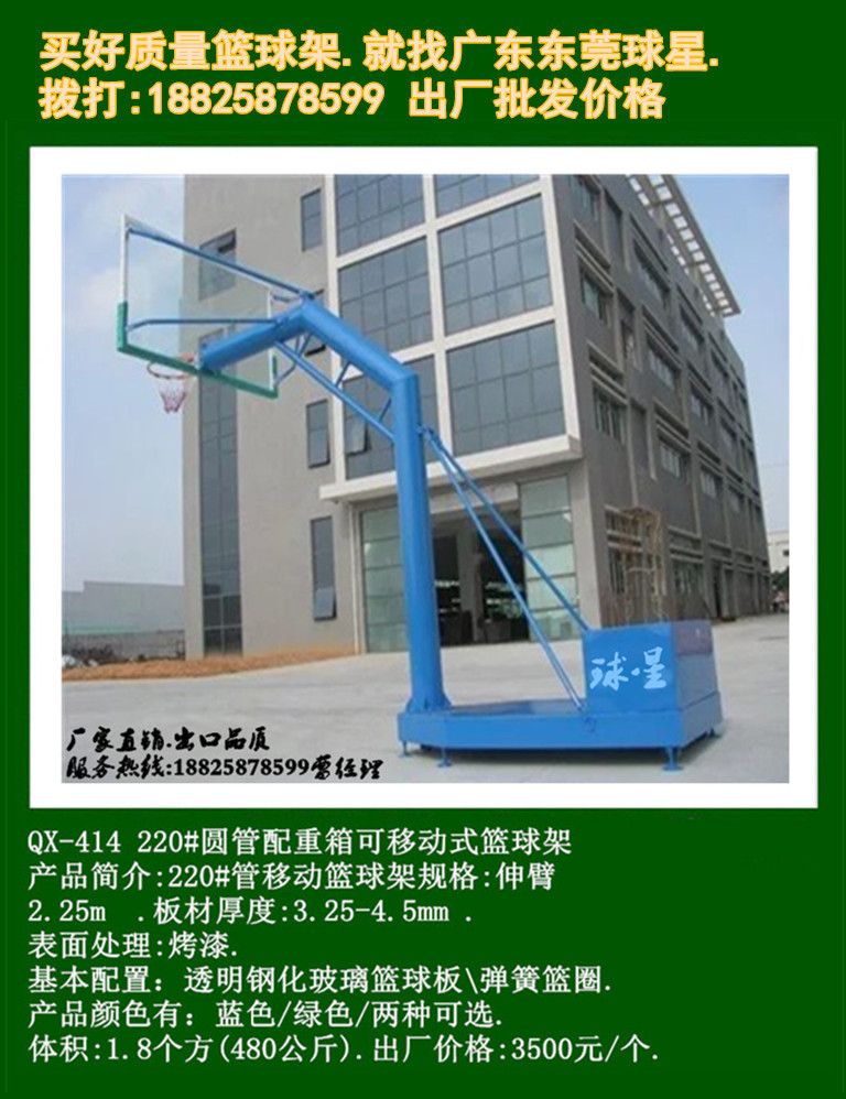 籃球架系列產品顏色為:綠色、藍色、可選.可根據(jù)用戶需求改變顏色,產品在沒有特別說明的前提下默認為根據(jù)庫存隨機從綠、藍兩種顏色中隨機抽取發(fā)貨。