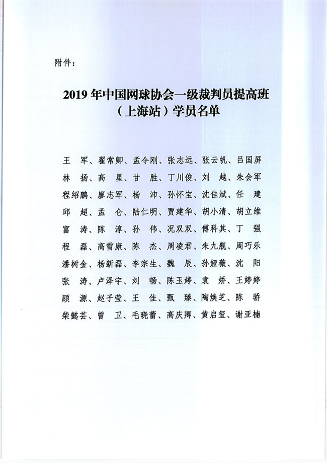2019年中國網(wǎng)球協(xié)會(huì)一級裁判員提高班(上海站)補(bǔ)充通知