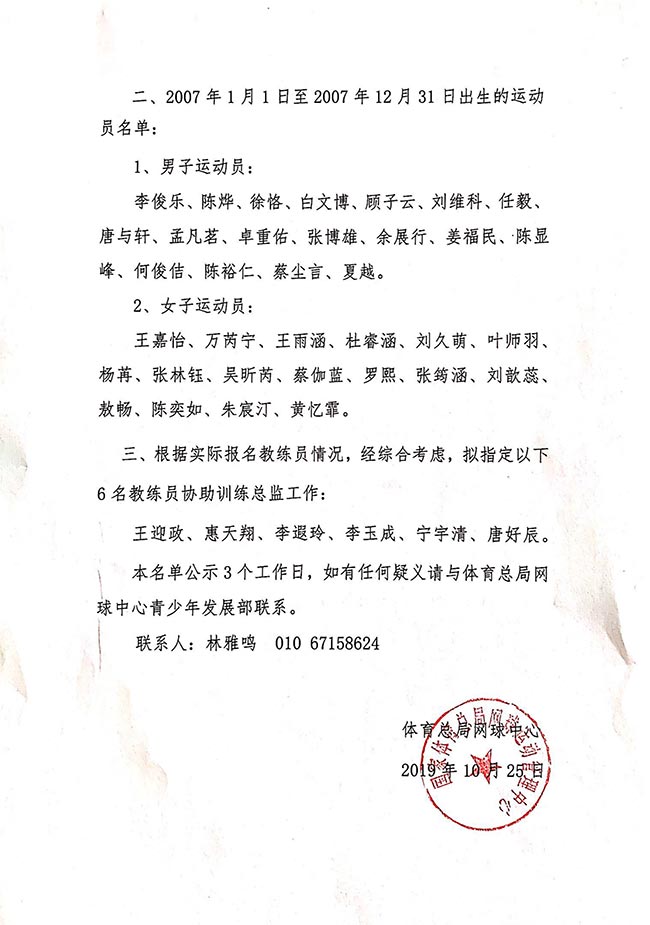 關(guān)于獲得2020年度國家少年網(wǎng)球隊運動員選拔提名資格名單的公示