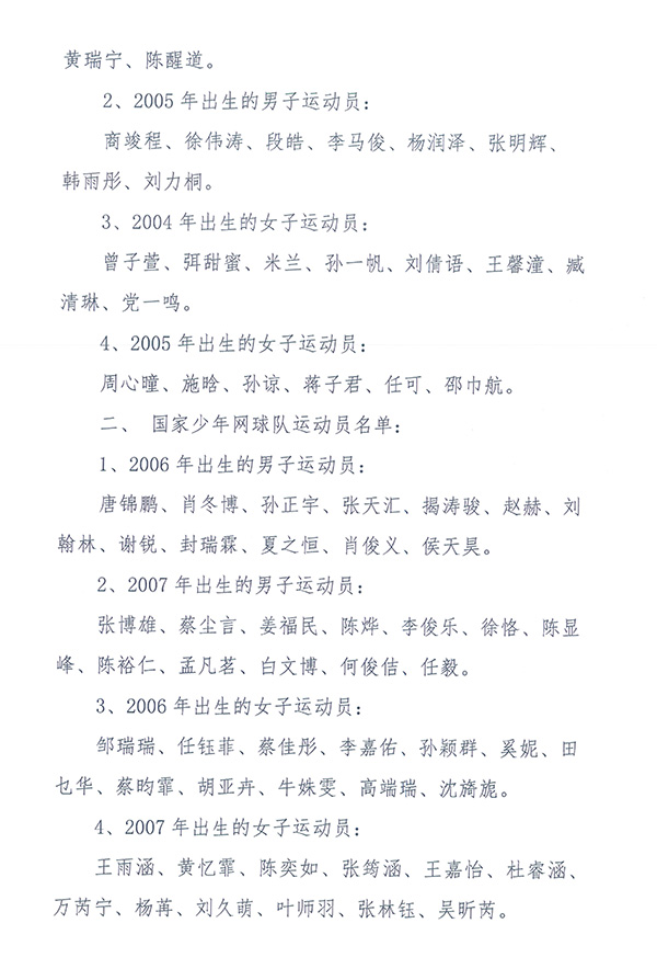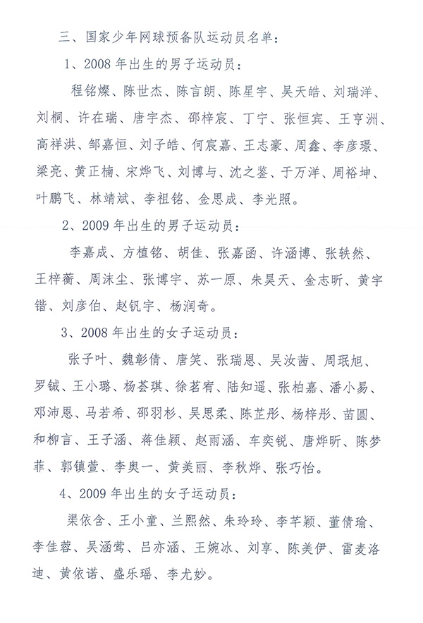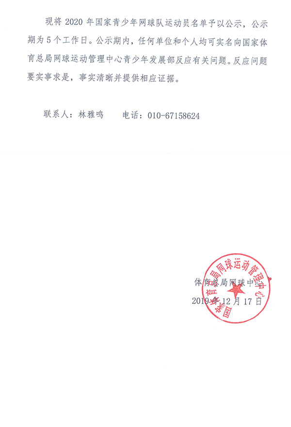 關(guān)于公示2020年度國家青少年網(wǎng)球隊運動員名單的函