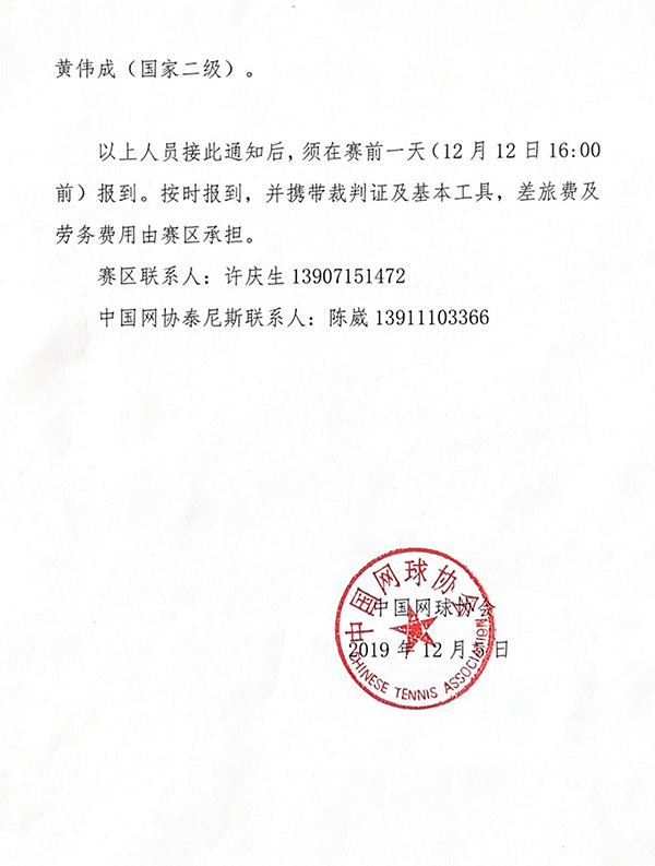 關(guān)于參加首屆中國(guó)網(wǎng)球巡回賽裁判員培訓(xùn)班的補(bǔ)充通知