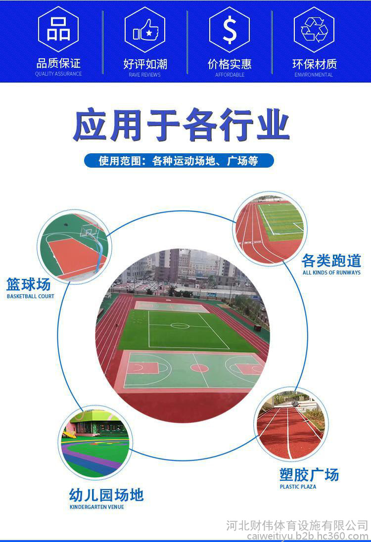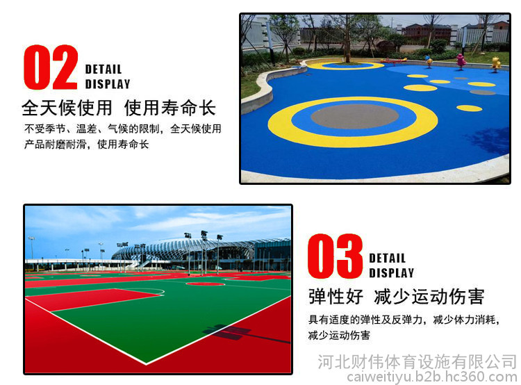 ??安穩(wěn)性:混合型塑膠跑道具有優(yōu)異的抗老化及耐鹽霧、濕熱、臭氧、紫外線功用,內(nèi)涵物理機(jī)械性能及外觀結(jié)構(gòu)特征恒久不變,延伸其 運(yùn)用壽命。實用性:塑膠跑道是全天候跑道,在具有恰當(dāng)排水系統(tǒng)時,大雨后或沖刷后也能當(dāng)即用于練習(xí)、比賽和游戲,且其運(yùn)用性能不變。