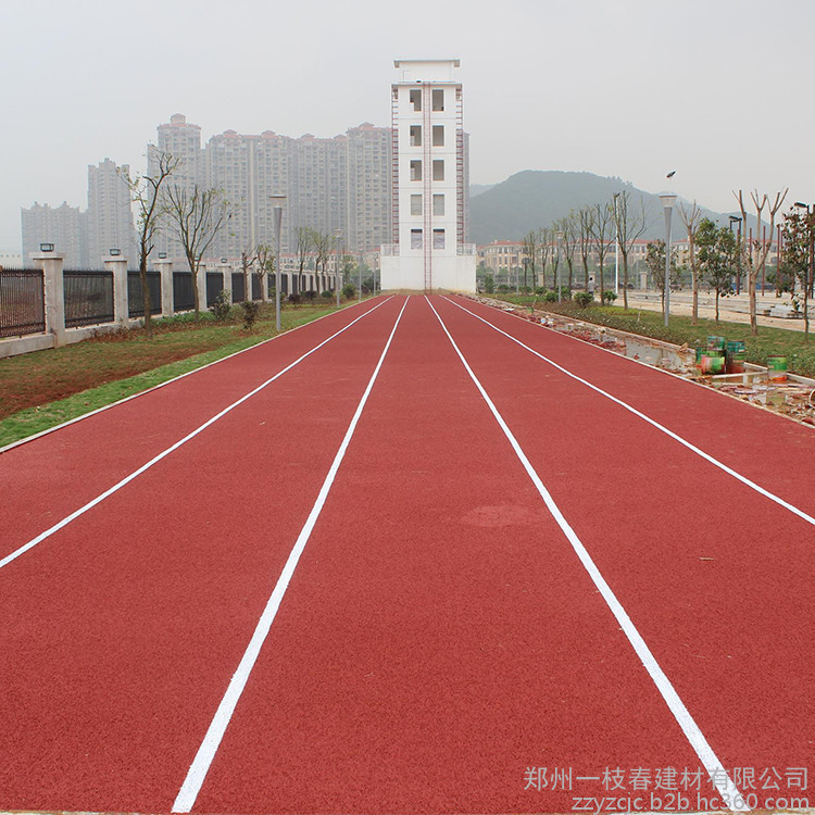 4、混合型塑膠跑道是PU與黑色橡膠顆粒按一定比例混合而成跑道系統(tǒng)。材料運(yùn)到現(xiàn)場按一定比例混合,加入催化劑攪拌均勻,攤鋪,常溫硫化成型,該面層是現(xiàn)時有標(biāo)準(zhǔn)的塑膠面層材料,主要用于專業(yè)比賽用場地等。