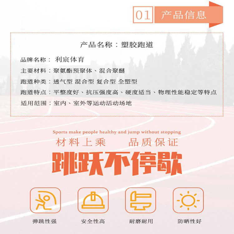 環(huán)保性:采用新型環(huán)保原料,不危害使用者健康;在材料配方上依據(jù)不同地區(qū)陽光紫外線的數(shù)據(jù)來調(diào)整使用紫外線吸收劑及抗氧劑等,能有效延緩老化;不易脫粒、開裂、起泡,從而極少產(chǎn)生影響環(huán)境衛(wèi)生的塑膠顆粒;耐摩擦、耐酸堿、耐老化,使用壽命長。2、安全性:根據(jù)不同場地的要求,調(diào)整材料的厚度、彈性和摩擦系數(shù),以適合不同運(yùn)動對安全的要求;彈性適度、防滑性好,能有效保護(hù)運(yùn)動員的韌帶、肌肉、皮膚,以防拉傷或擦傷;適度的緩沖性可適度地吸收腳步的沖擊力,減少運(yùn)動傷害。3、有效性:材料的各種系數(shù)的可調(diào)節(jié)性便于針對不同運(yùn)動特性的場地使用能提高運(yùn)動效率的材料;通過使用透氣、透水的材料和相應(yīng)的施工工藝,可滿足場地的全天候使用的要求,即使大雨剛過,也可立即投入使用;適度的彈性可減少體力消耗,從而可增加訓(xùn)練時間或增進(jìn)競賽成績;較強(qiáng)的抗釘力和耐壓縮性可將釘鞋、體育器械對場地的破壞減至少,使場地保持一貫的有效性;專業(yè)的施工和使用自流平材料,可使表面更平坦,從而更有效地訓(xùn)練和比賽;美觀的外觀和顏色搭配,在心理上對運(yùn)動效率有積極作用。產(chǎn)品外觀:水白色或微黃色澄清透明液體