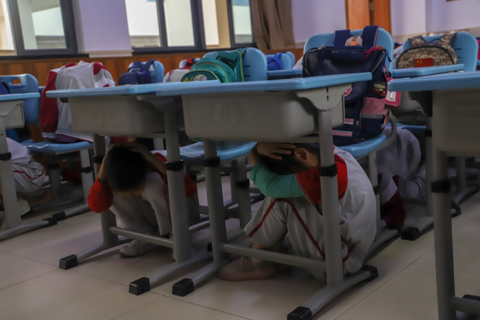 演練前,學(xué)校安全科結(jié)合實(shí)際情況,成立防震減災(zāi)演練工作指揮組,指揮組完善疏散演練方案,部署演練工作,明確疏散演練集合地點(diǎn)、疏散順序和注意事項(xiàng);各班召開防震自救專題班會(huì),讓學(xué)生了解應(yīng)急避震知識(shí)、熟悉逃生路線。演練開始后,各班老師們迅速到崗,當(dāng)聽到發(fā)生地震的警報(bào)時(shí),同學(xué)們迅速雙手抱頭,躲避在課桌下緊急避險(xiǎn),在老師的組織下,有序進(jìn)行撤離,用最短的時(shí)間,從教學(xué)樓上安全撤離到了指定地點(diǎn)。