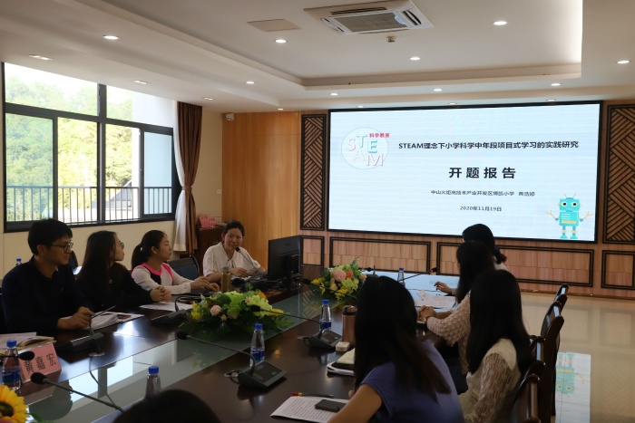 會(huì)上,開(kāi)發(fā)區(qū)博凱小學(xué)幾個(gè)課題主持人先后作開(kāi)題報(bào)告,介紹課題研究方案。黃浩婷老師向大家介紹了課題《STEAM理念下小學(xué)科學(xué)中年段項(xiàng)目式學(xué)習(xí)的實(shí)踐研究》的研究意義、研究現(xiàn)狀、研究目標(biāo)、研究?jī)?nèi)容、主要?jiǎng)?chuàng)新之處、研究方法、研究計(jì)劃、預(yù)期研究成果等內(nèi)容。