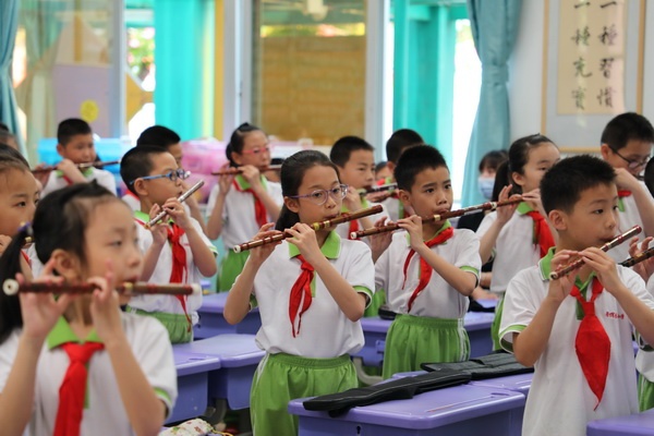 清晨的校園里隨處可見忙碌的身影,竹笛社團的孩子們在學校西門吹奏《青花瓷》《我愛你中國》《童年》等曲目,用優(yōu)美旋律迎接各方來賓;南門名人園里,在鐘遠良老師的電子琴伴奏下,六2班袁鴻林、六5班劉馨瑜等幾位優(yōu)秀竹笛學生代表輪番演奏《牧民新歌》《姑蘇行》等經(jīng)典曲目;東門童趣園里,六6班全體學生吹響《每當我走過老師窗前》《紅星歌》等耳熟能詳?shù)母枨?/p>