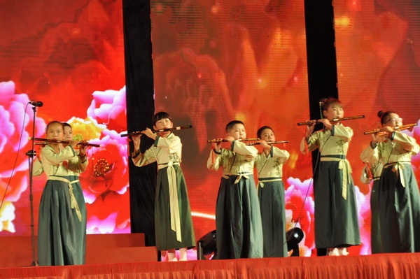晚上7點30分,學校運動場燈光流轉(zhuǎn), “綻放”十周年校慶文藝晚會準時開幕。開發(fā)區(qū)文體教育局局長趙云清、中山市教育招生考試中心副主任周勇、開發(fā)區(qū)教育事務指導中心主任鐘海清、副主任關(guān)影紅及區(qū)內(nèi)各學校領(lǐng)導出席。本次晚會分為蓄力飛翔、感動十載、筑夢未來三個篇章,共13個節(jié)目。首先,在呂曉寧老師的指揮下,全體學生整齊起立,二至六年級共1800多名學生用手中的竹笛奏響《歡迎曲》,一年級的學生則用雙手打起節(jié)奏,現(xiàn)場千人合奏場面震撼,彰顯香暉園小學全面普及竹笛教育的成果。本場晚會,葉建林老師的竹笛獨奏《春到湘江》、呂曉寧老師指導的民樂合奏《金蛇狂舞》、竹笛合奏《揚鞭催馬運糧忙》以及余夢園老師指導的竹笛二重奏《跑旱船》等精彩的竹笛節(jié)目更是將小小竹笛的魅力呈現(xiàn)得淋漓盡致。此外,故事講演、情景劇、合唱、創(chuàng)意服裝秀等豐富多樣的節(jié)目更是精彩紛呈,現(xiàn)場氣氛熱烈。