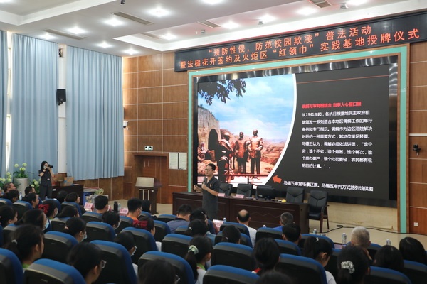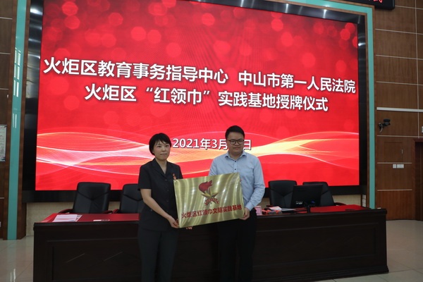 活動首先進(jìn)行“法槌花開”簽約及火炬區(qū)“紅領(lǐng)巾”實(shí)踐基地授牌儀式,在全體與會人員的共同見證下,中山市第一法院審判管理辦公室負(fù)責(zé)人丁向娜與火炬開發(fā)區(qū)德育專干謝藝波上臺現(xiàn)場簽約,謝藝波代表火炬開發(fā)區(qū)教育事務(wù)指導(dǎo)中心向中山市第一人民法院授予“火炬區(qū)紅領(lǐng)巾文明實(shí)踐基地”牌匾。丁向娜表示,中山市第一人民法院開展“法槌花開”系列普法活動,旨在以法院現(xiàn)場研學(xué)、與法官面對面交流、法律知識問答、模擬法庭、法官體驗(yàn)等豐富形式,達(dá)到以真實(shí)體驗(yàn)潤物無聲的普法效果,歡迎各學(xué)校組織學(xué)生到法院開展相關(guān)活動,進(jìn)一步提高學(xué)生法律和自我防范意識。