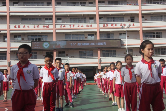 “同學們,你們知道每年6月3日是什么日子嗎?這一天,是載入中國史冊的日子。德育處梁玉珊主任利用國旗下講話,向全校師生講述了林則徐虎門銷煙的故事,發(fā)出“不忘虎門銷煙歷史,傳承禁毒文化精神”的倡議,對全體學生進行禁毒教育,并強調(diào)毒品是寄生在人類社會的一塊毒瘤,對個人、對家庭、對社會乃至對民族都有十分嚴重的危害。